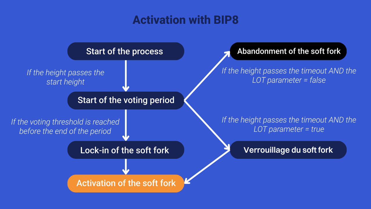 However, all these proposals revolved around using either BIP 8 or BIP 9. BIP 8 was a new activation method that took up the idea of BIP9 and added a new parameter called 'LOT' (Lock in on timeout), which can take the value of 'true' or 'false'. If this variable is set to 'false', BIP8 works in a similar way to BIP9, but if it is set to 'true', it automatically triggers a UASF if miners fail to signal.
