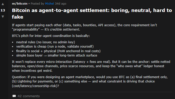 Some of the top posts include debates on Bitcoin payments for agents through L2 solutions, and how it could be the main asset for sovereign AI agents.
