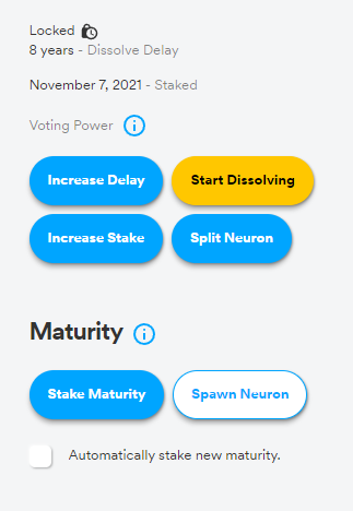 · Spawning a new neuron – Once you reach a certain amount of maturity, you can spawn a new neuron with it. This new neuron will have a one-week dissolve delay, after which it will be unlocked, and you can transfer it out of the NNS.