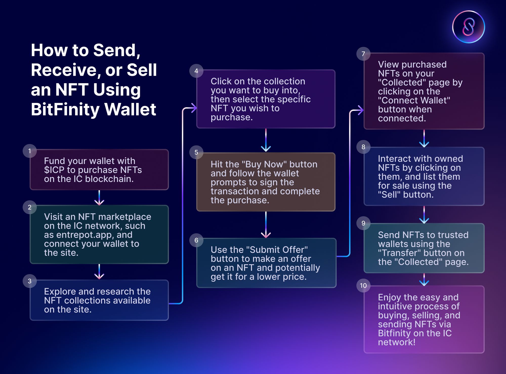 On ICP the whole process of buying and selling NFTs via Bitfinity is easy and intuitive.