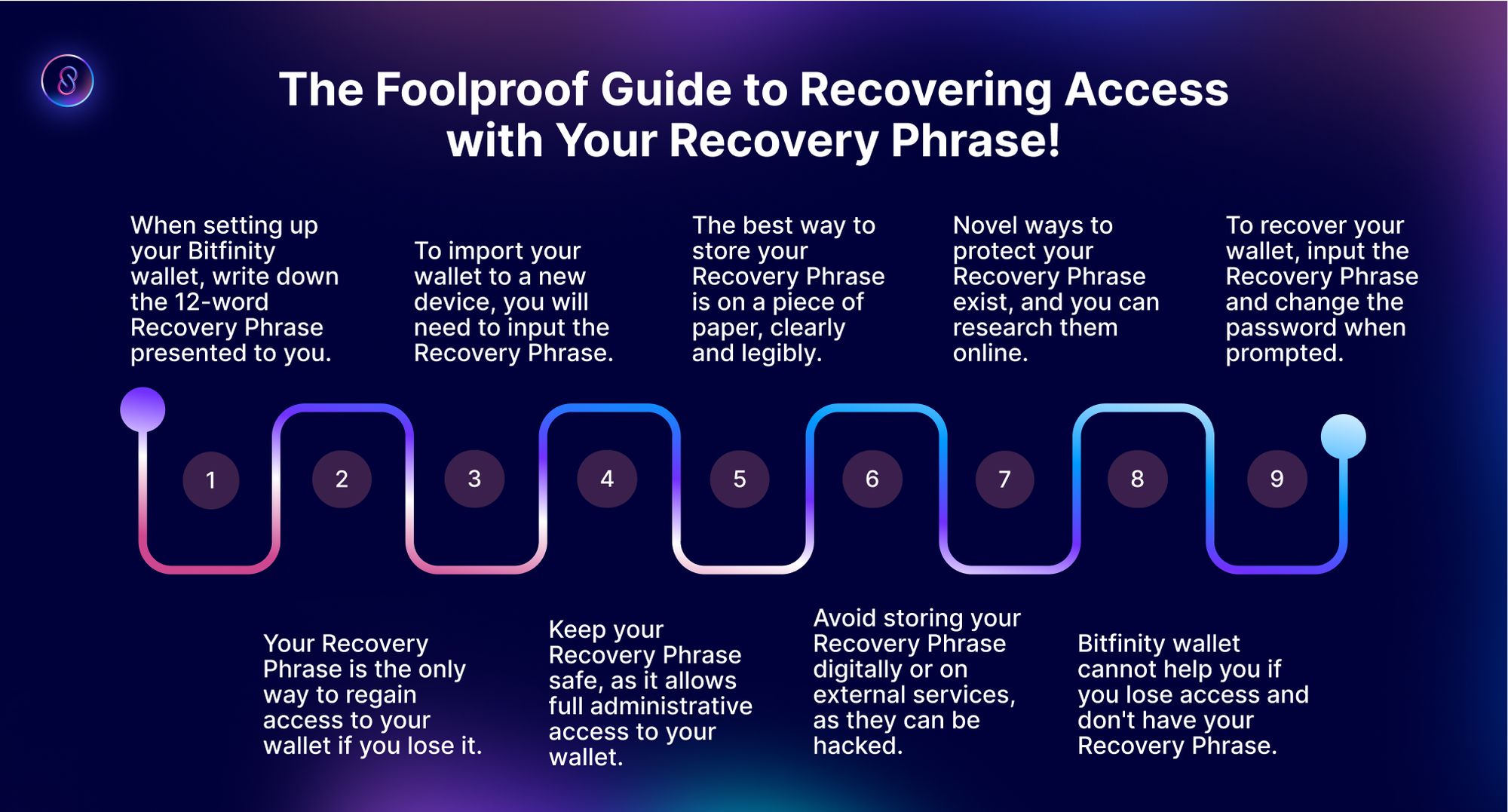 It is important to note that Bitfinity wallet cannot help you if you lose access to your wallet and have lost your Recovery Phrase.