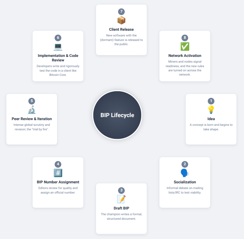 - [BIP 2]: Outlines the specific mechanics, formatting and lifecycle of a BIP (Draft → Proposed → Final/Rejected).